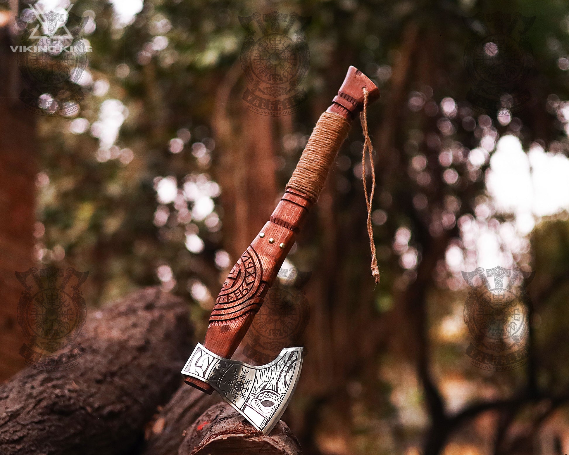 The head is etched with ancient norse symbols: the Runes, the Hem of Awe, and Odin's face. The etching is deep and will last a lifetime and the axe will be a family heirloom passed down from generation to generation.