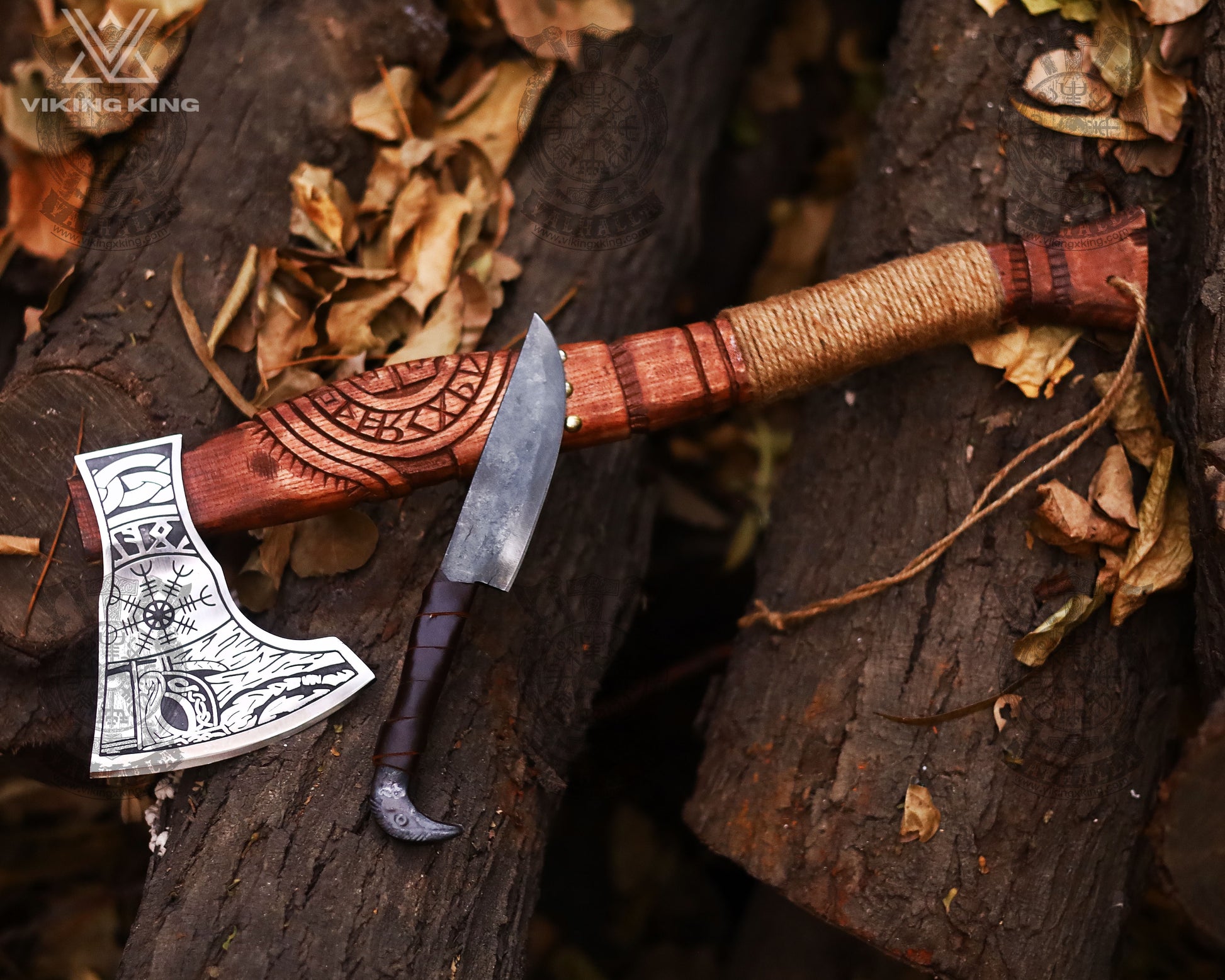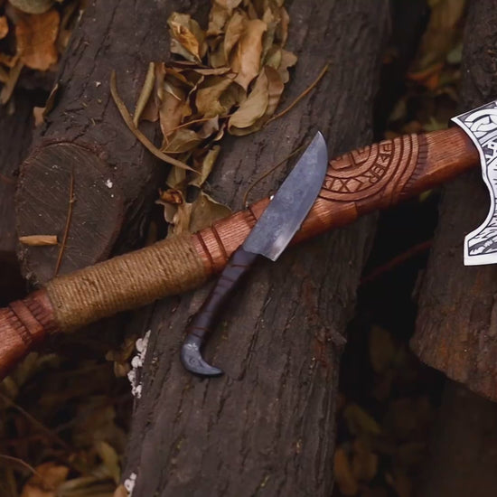 HANDMADE BATTLE AXE WITH ETCHED NORSE SYMBOLS with Raven Knife
